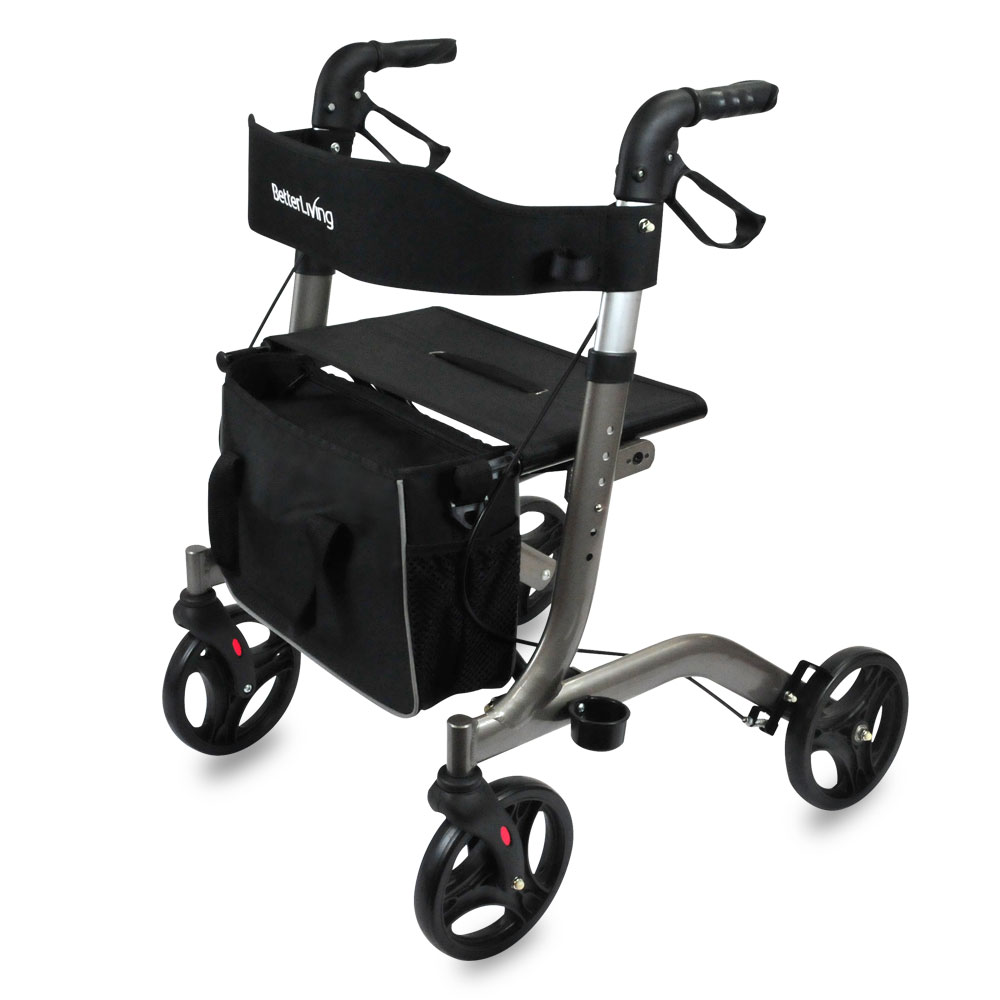 BetterLiving Euro Style Wheeled Walker - 8 inch (200mm) Wheels. Lightweight aluminium designed for easy, every day use. Suits users of average height and weight. Adjustable handle height, stable backrest for maximum comfort, detachable weatherproof fabric bag. Total weight 6.6kg, floor to handle height 800mm - 930mm, seat width 450mm, floor to seat height 540mm. Colour: Gun Metal