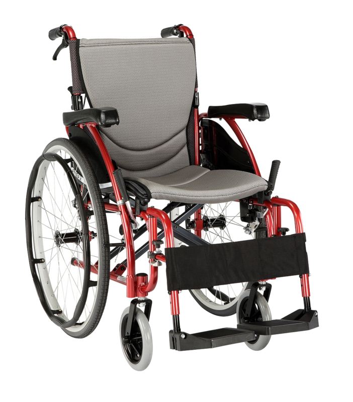 Lightweight Wheelchair with the unique S shaped seat. Seat and backrest upholstery and pads treated with Aegis Microbe shield to reduce stains and odour. Swing away foot plates and arm rests, quick release solid rear tyres, push to lock with attendant braking system, folding back. Seat: 460x430mm. Seat Height: 510mm. Back Rest Height: 400mm. Weight: 14.5kg. Maximum Weight Capacity: 115kg. Anti tip bars are not included but are available to order.