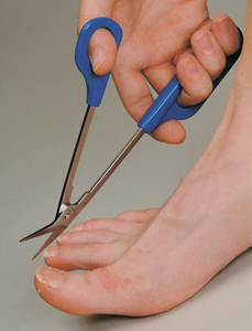 Long handled scissors with angled blade specifically designed for toe nails.